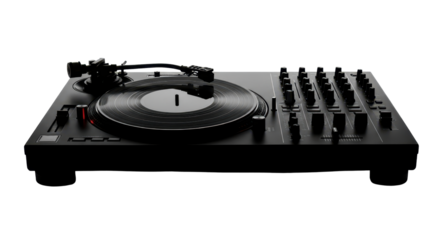 High quality DJ turntable with black vinyl record, with sleek design isolated on transparent background, PNG cutout.