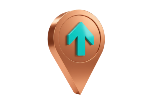Copper location pin with turquoise arrow isolated PNG, 3D map pointer for navigation and direction on transparent background