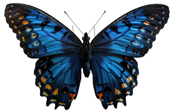 Very beautiful blue yellow orange butterfly in flight isolated on a transparent background. Ai generated