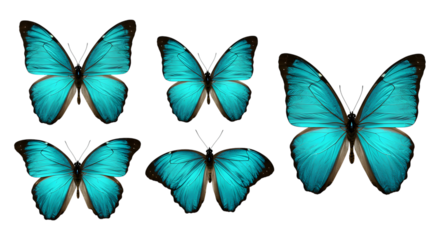 Six Vibrant Turquoise Morpho Butterflies on transparent background;  High-Resolution Stock Image; Serene, Elegant Mood.