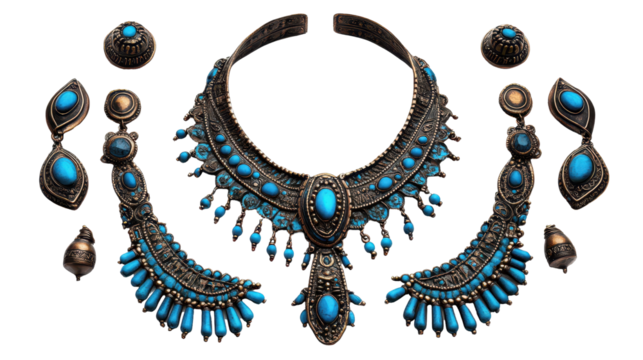 Intricate jewelry set featuring turquoise stones in antique metal design. transparent background