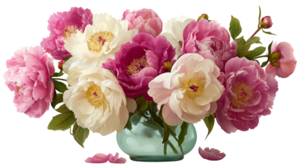 Abundant bouquet of lush pink and cream peonies in a turquoise glass vase, perfect for floral celebration invitations, wedding decor, or springtime marketing campaigns.