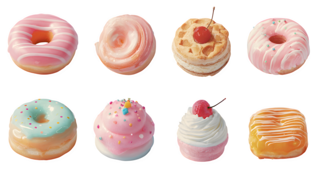 Cartoon donut with yellow icing and pink drizzle on transparent