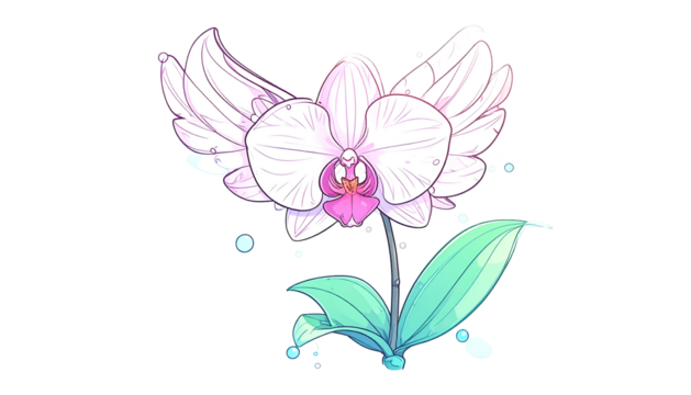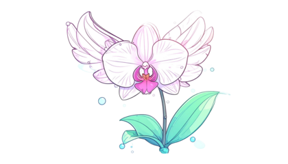 Delicate orchid illustration featuring a graceful bloom, stem, leaves, and bubbles