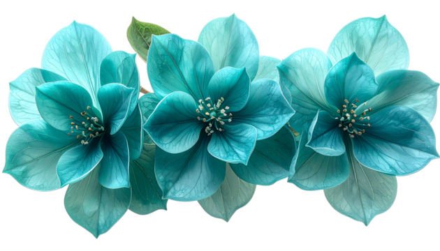 Four light turquoise-colored flowers with white centers and edges