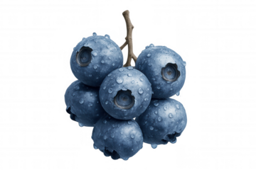Fresh blueberries with water drops on a twig, healthy berry fruit group on transparent background