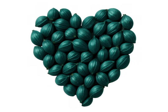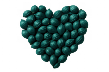 Turquoise seed pods arranged in a heart shape on a transparent background, creating a unique and visually appealing design