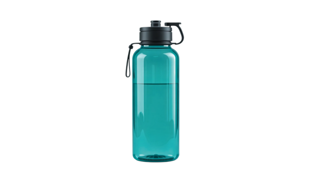 A clear turquoise reusable water bottle with a black cap and strap, perfect for hydration on the go and reducing plastic waste