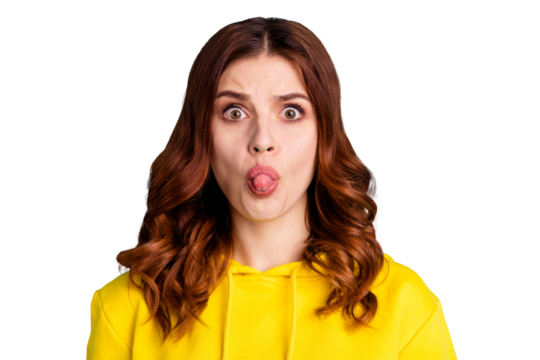 Cheerful girl teasing with tongue out and hands on ears transparent