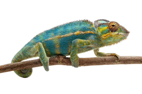 Isolated on a white background is a Panther chameleon, an animal that is yellow and blue in color
