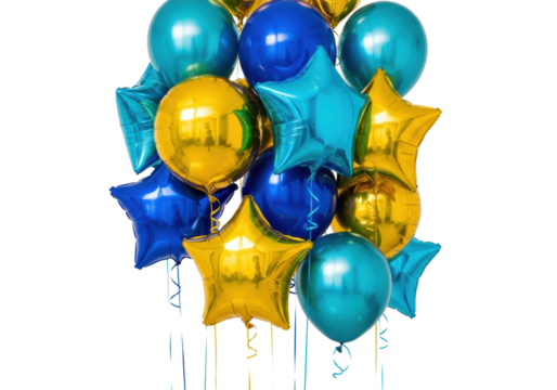 a cluster of reflective metallic foil helium balloons (gold, royal blue, turquoise, star and round shapes) suspended against a seamless white studio backdrop with copy space, festive commercial