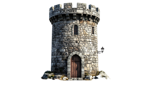 Stone Castle Tower with Green Ivy and Crenellated Battlements, isolated on a transparent background, cutout, PNG