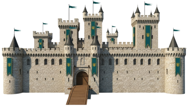 Isolated medieval fantasy castle with drawbridge, stone walls, banners, and pointed towers