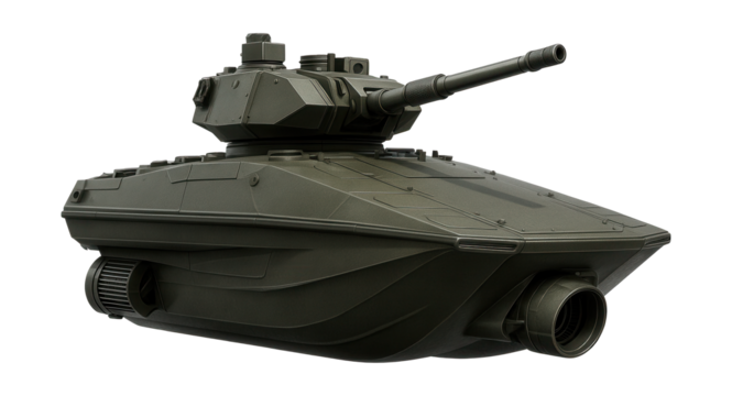 Amphibious vehicle featuring a turret and water jet propulsion.