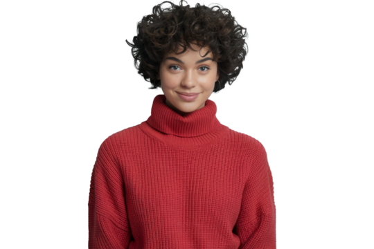 Smiling woman in red hooded jacket over gray sweater on transparent background