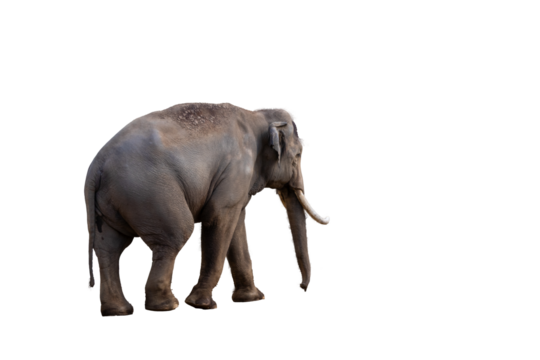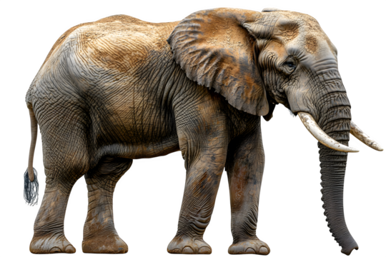 Adult African elephant bull with large tusks and wrinkled grey skin, walking forward against a stark white studio background with dramatic lighting, concept of powerful wildlife and natural grandeur