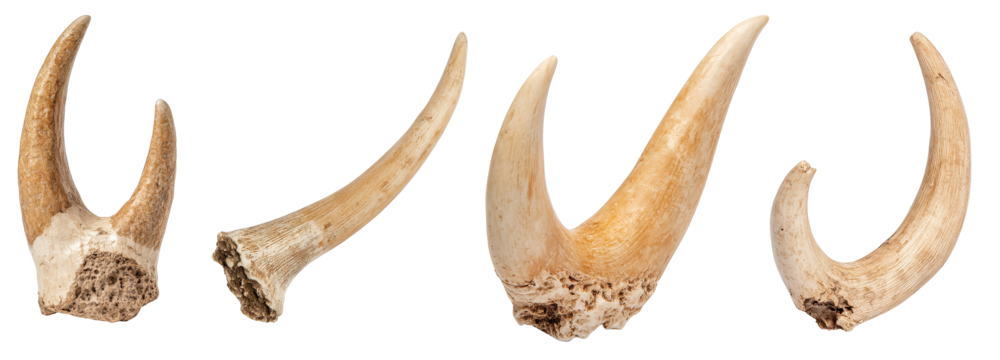 Curved bone tusk with textured base isolated on transparent background. Cream horn isolated on white background.