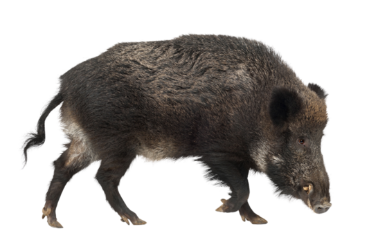 Isolated wild boar tusk showcases raw power against clean white background. Detailed texture on curved animal tusk provides authentic feel for wildlife or hunting projects. Powerful single tusk.