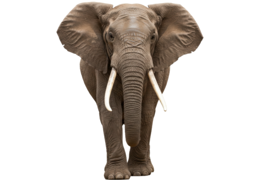 Isolated African elephant standing proudly, with wrinkled skin and long ivory tusks viewed straight on