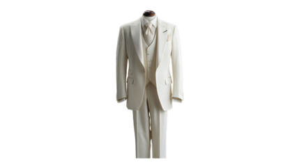 Black tuxedo suit with bow tie and white shirt on a mannequin isolated on a transparent background. Luxury businessman or groom clothing fashion, wedding style, elegance wear, gentleman tailor
