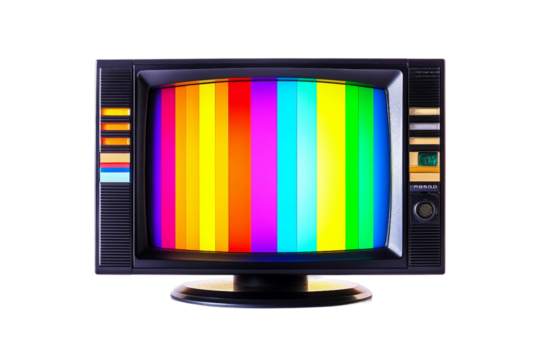 Retro vintage television with antenna glowing screen and brown wood-grain cabinet isolated on black isolated on transparent background