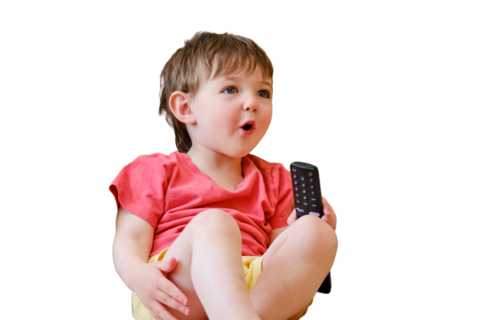 Watching cartoons on TV has brought so much happiness to the baby as they sit on the sofa with the remote control in their hand, isolated on white background. Kid aged about two years