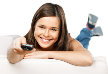 Couple relaxing with remote viewing blank transparent television
