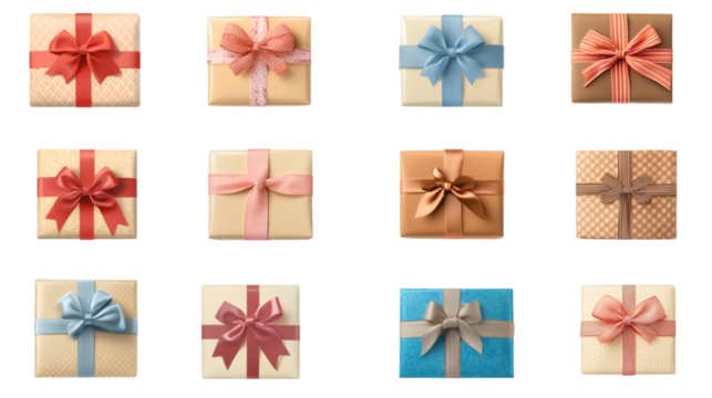 Twelve colorful gift boxes with ribbon bow isolated on transparent background, ideal for celebrations and anniversaries