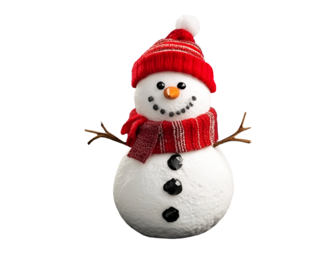 A cheerful snowman with a red hat, black buttons, and twig arms isolated on white background. Concept of winter fun.
