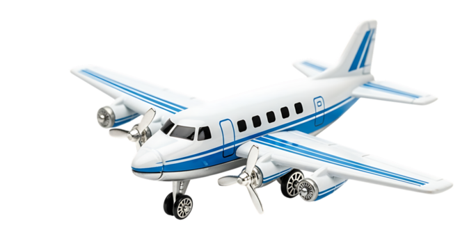 Vintage Twin Engine Propeller Airplane Toy with Blue Stripes on White Background aircraft
