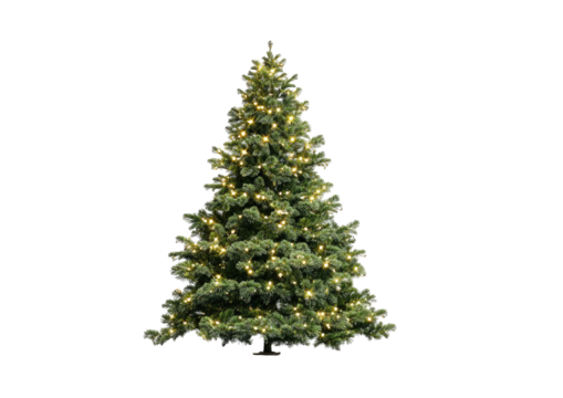A fully decorated, realistic evergreen tree, illuminated with soft, warm golden fairy lights against a black backdrop
