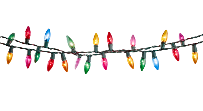 Round Christmas wreath with pine branches, red berries and twinkling lights, isolated on a transparent background