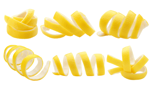 lemon peel twist garnish isolated on white background. curly zest
