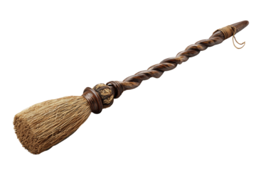 Rustic twisted wooden handle broom with natural bristles isolated on a transparent background witch magic