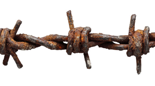 Rusty barbed wire closeup with sharp twisted metal, detailed texture of weathered iron, symbol of security, danger, and barriers isolated on transparent background