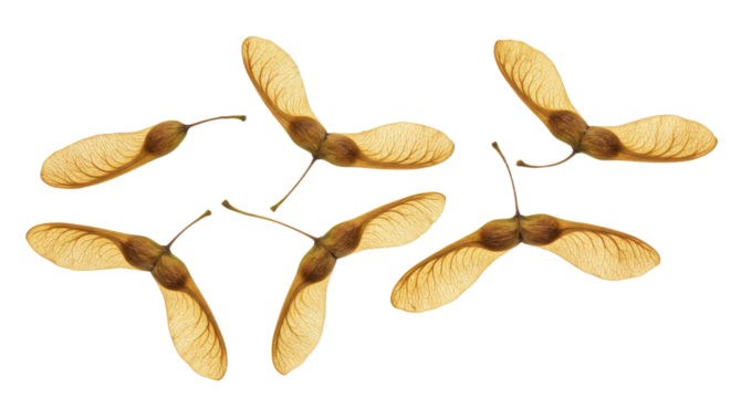 Two fluffy dandelion seed heads with a single seed floating between them, isolated on a white background.