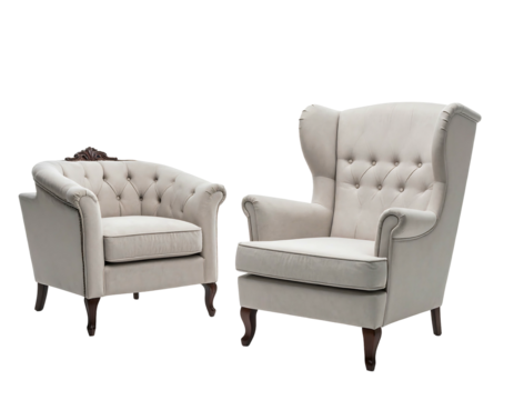 Two cream-colored armchairs with button-tufted backs & dark wood legs are isolated on a black background