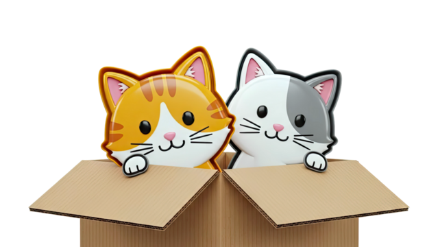 Two cute cartoon cats peeking out of a cardboard box