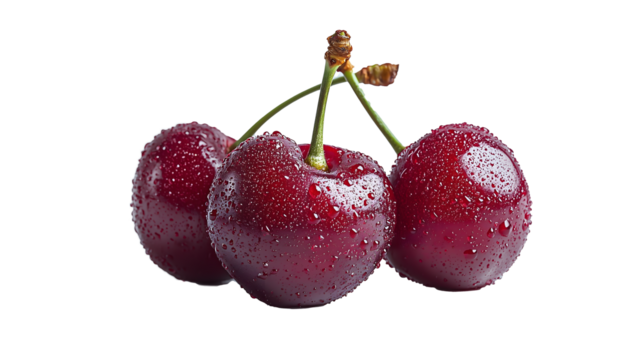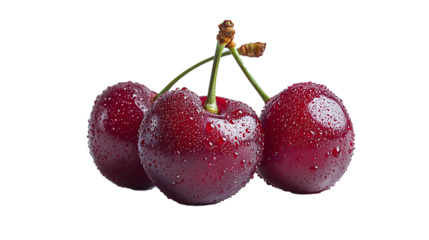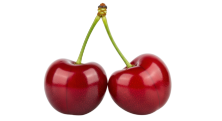 Two ripe cherries joined at the stem isolated on transparent background studio shot