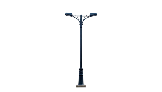 A tall, ornate street lamp with two upward-facing lights against a stark black background