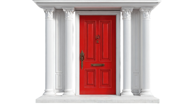 Red elegant front door framed by two decorative pillars showcasing classic architectural style on white background