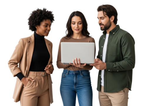 Smiling man pointing and woman in white blazer, isolated on transparent background