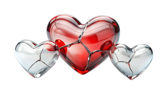 Three glass hearts one red two clear isolated on a transparent background broken