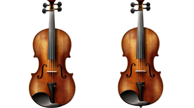 Duo of Violins: A pair of exquisitely crafted violins, rich in warm, amber tones, stand side-by-side, their elegant curves and intricate details showcased in a captivating display.