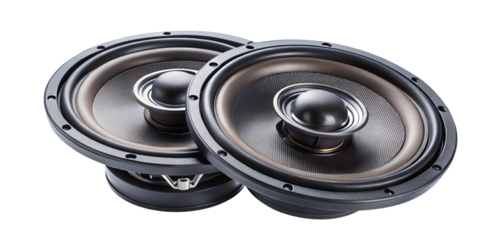 Two premium quality car audio speakers arranged artistically on a white background