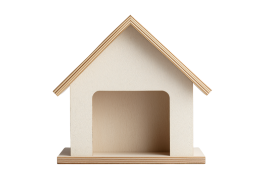 Simple wooden house shaped sign with two blank panels and a large opening isolated on a transparent background
