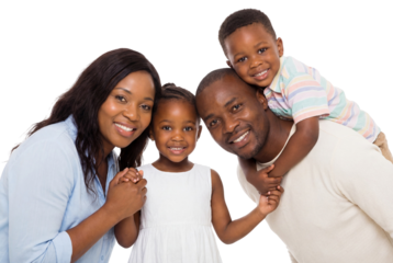 A simple white icon representing a family of four, including two parents and two children, isolated on a transparent background
