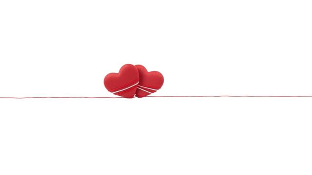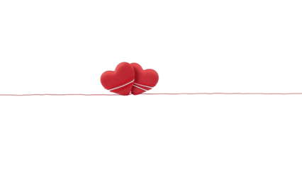 Two red heart shapes tied together with white strings on a thin red line, isolated on transparent background with natural lighting and warm tones