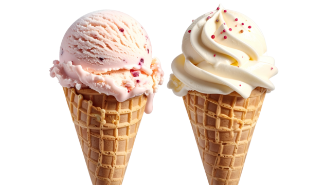 Two Unique Flavored Ice Cream Cone Designs, Isolated on Transparent Background.