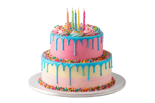 Festive two tiered birthday cake with colorful frosting sprinkles and lit candles against a black